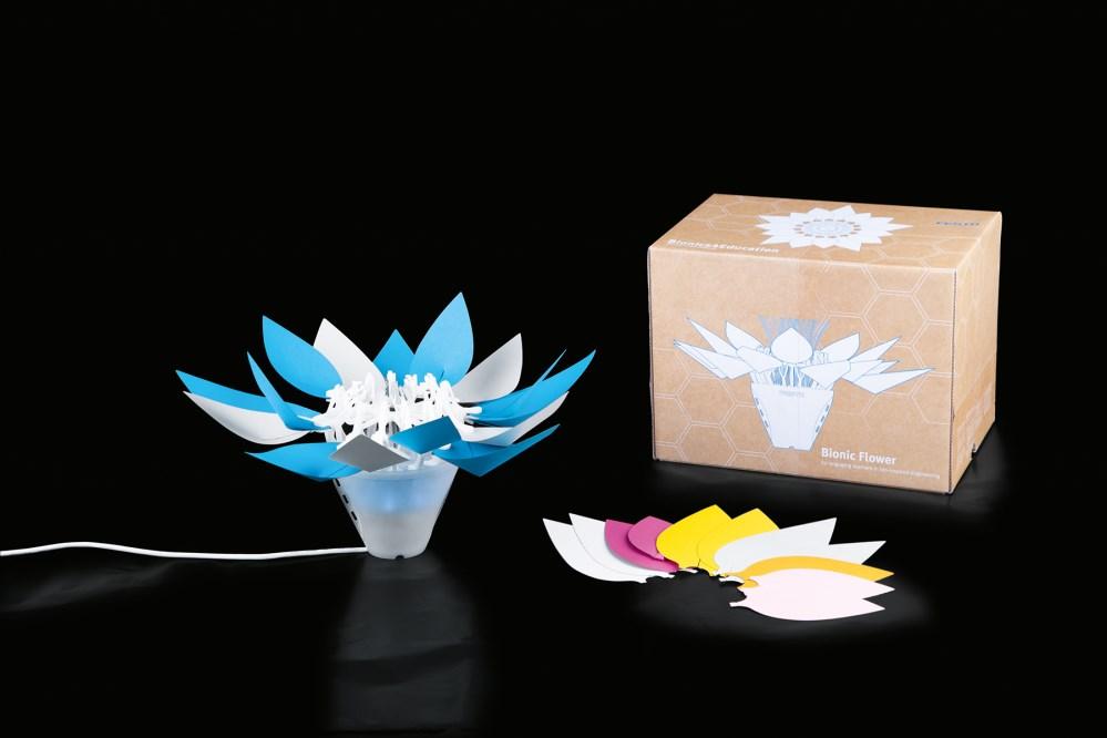 The Bionic Flower is a construction kit inspired by the plant world. It opens and closes its petals in response to external influences such as approach or light.