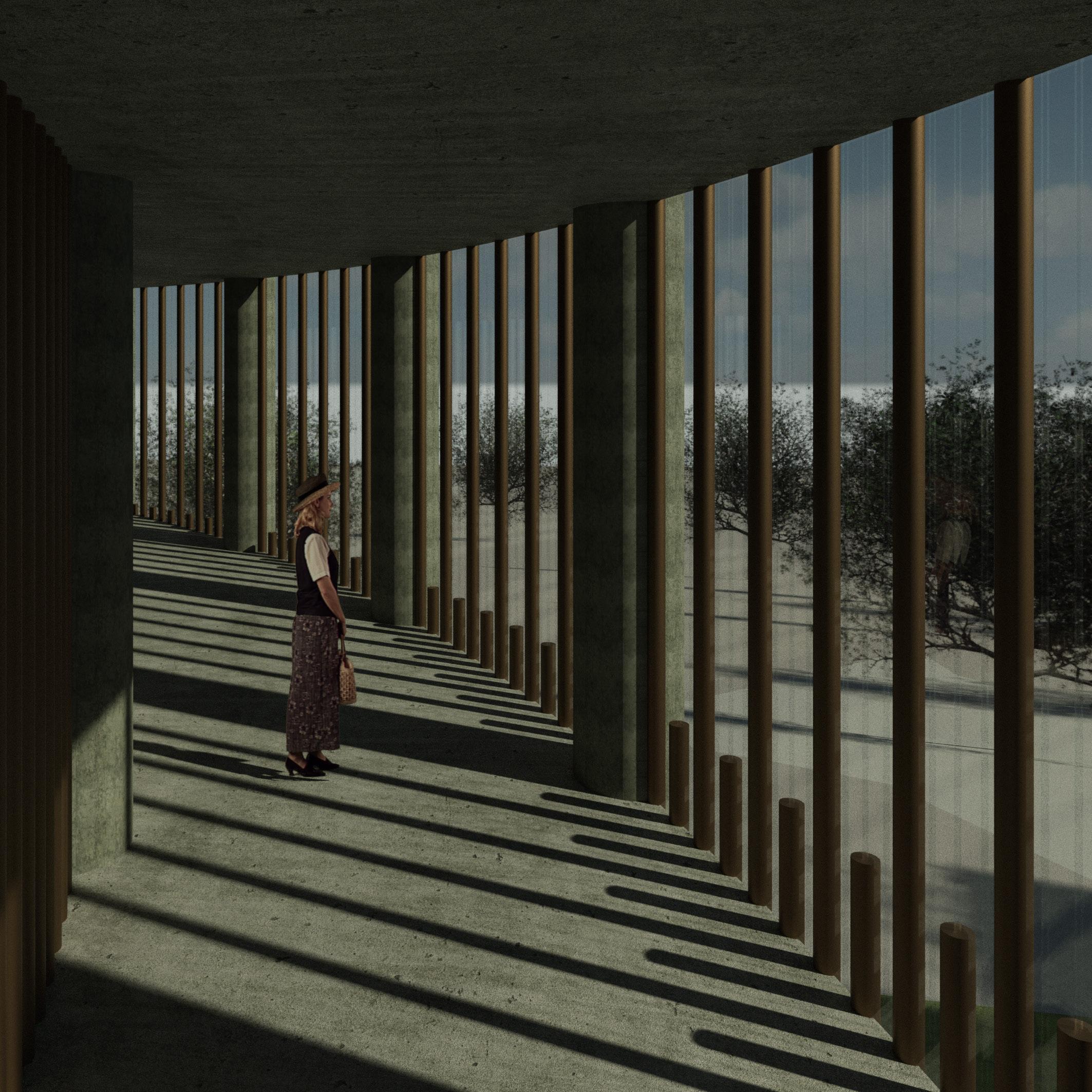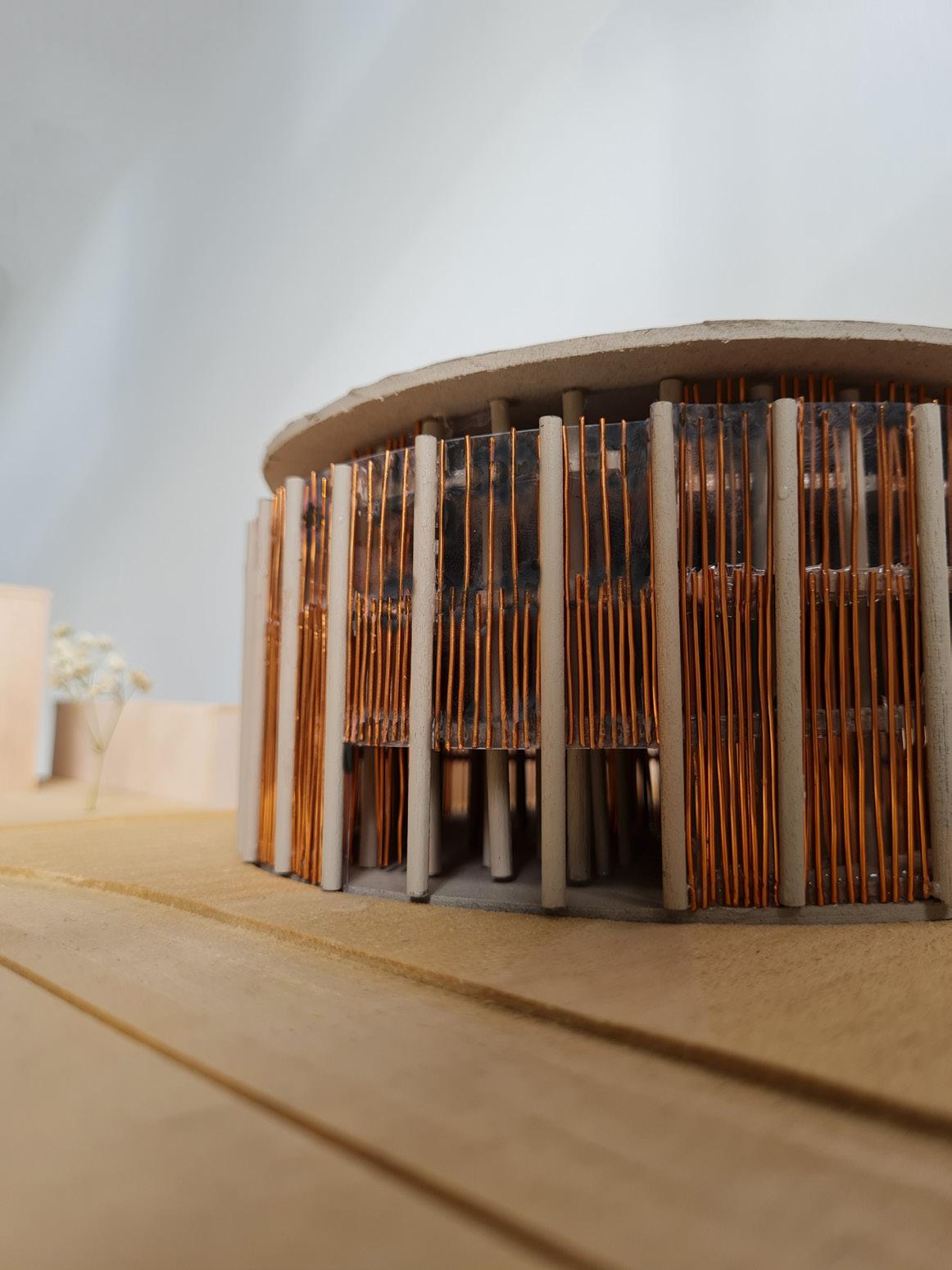 The original idea for this design came from the idea of a labyrinth within an amphitheatre, housing both the performance space and the gallery at the same time. As the project pushed forwards, the labyrinth was extended to four storeys and a cut was made through the centre. This cut allowed for direct access to and from the southern laneway, and allowed visitors to glimpse the cross section of the labyrinth. Eventually the walls of the labyrinth became the columns, in order to better provide a framework for the spaces and circulation within the building. The final design sits like a jar in a field, surrounded by tall grasses. The roof appears to float above the exterior facade, an effect which is heightened by the copper pipes on the facade getting thinner for each level above.