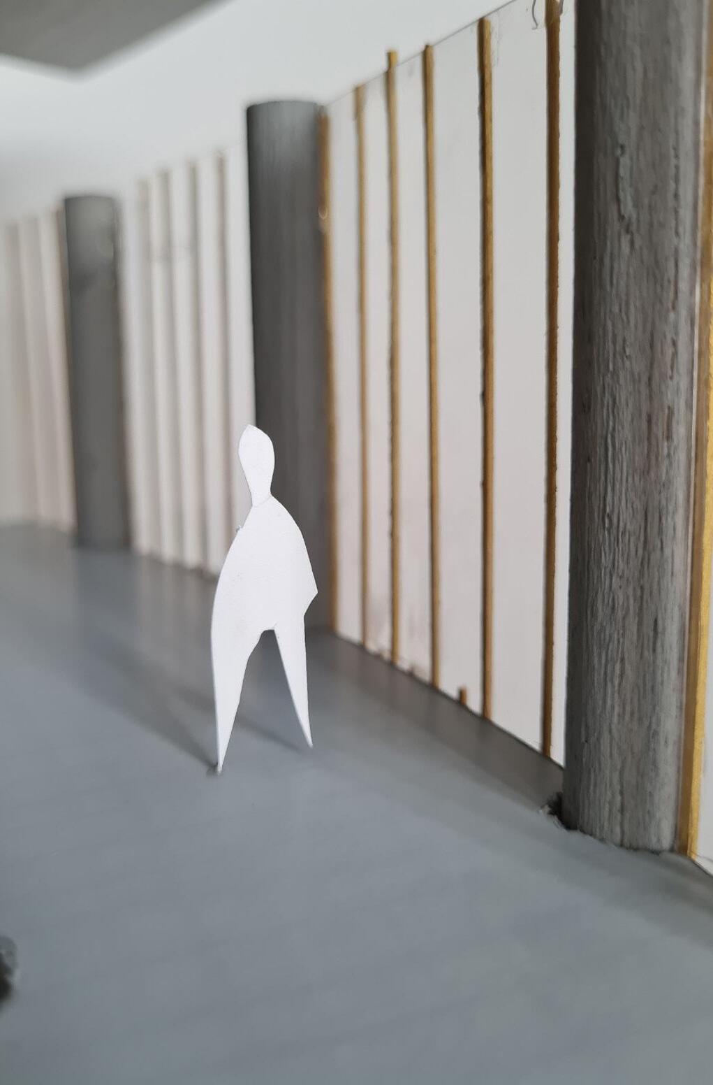 Finally, visitors come to the third floor. On this floor the columns once again free themselves from the walls, but now they are less intimidating and more welcoming. The visitors have accepted the columns as they have learned to accepted change. When they leave down the centre stair, they will see how the columns reach through the floors and back down to the ground floor. Only now, the columns are not imposing but sheltering.