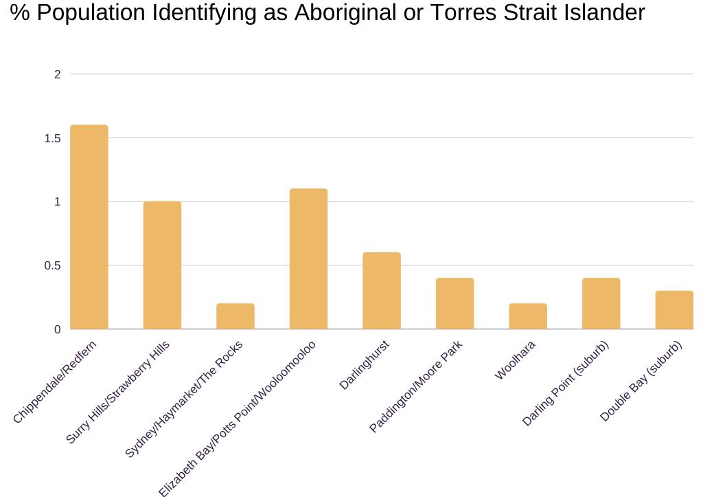 It is also crucial to address the rich Indigenous history of Redfern and surrounds. The Chippendale/Redfern and Elizabeth Bay/Pots Points/ Wooloomooloo statistical areas have a significantly higher percentage of First Nations residents compared to the rest of the catchment. The railyards and warehouses once provided income for many working class families, however, as this area became more gentrified, many social housing complexes were demolished and the once thriving Indigenous community was displaced.