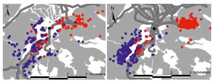 Links: Standorte besenderter Auerhühner im Südschwarzwald (Baden-Württemberg) im Winter vor Beginn des Wintertourismus (grau Wald, weiß Offenland, Schlange: Wege und Straßen)