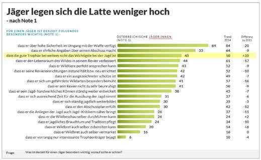 Zunächst fällt eine Verschiebung des Antwortniveaus auf. Aktuell legen sich die Jäger die fachliche Latte niedriger als noch vor einem Jahrzehnt. Unverändert auf Platz Eins im Ranking, liegt die sichere Handhabung der Waffe. Wer „zu“ selten schießt, kann nicht ferm im Umgang mit der Waffe sein! Und auf Platz zwei folgt die „ehrliche Angabe über den Abschuss“. Schmunzeln. Offenkundig bestehen immer noch zum Teil erhebliche Diskrepanzen zwischen Papier und Revier. Der dritte Platz im Ranking ist eine Erfolgsgeschichte: Die gute Trophäe hat an Bedeutung verloren und ist nicht mehr das Wichtigste! Diese Haltung hat sich von 10 auf 45 Prozent nach oben entwickelt. Vor diesem