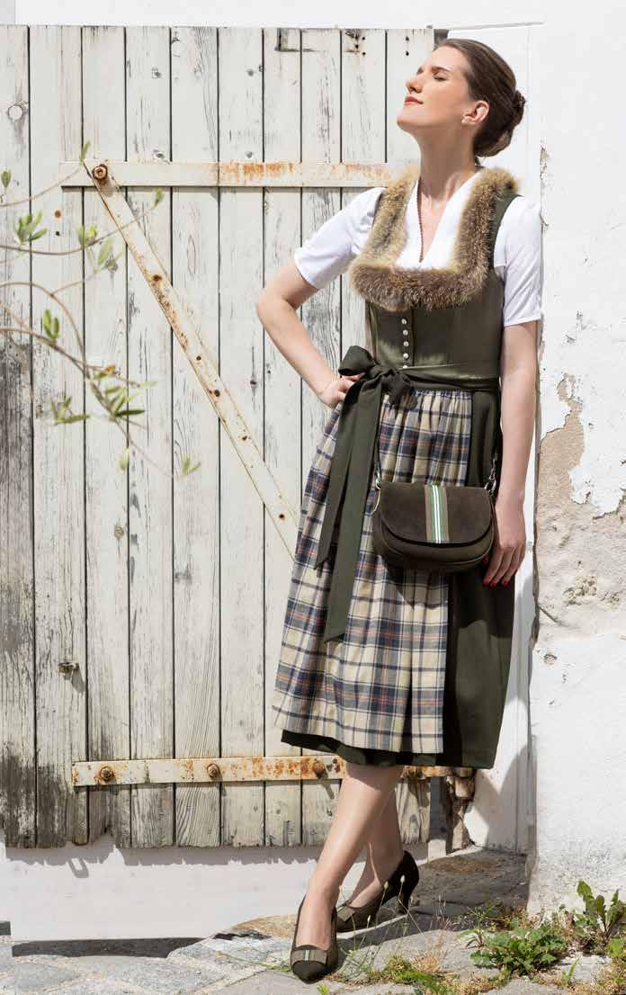 ⊳ Jägerball-Dirndl aus Wollsatin mit abnehmbarem Rotfuchs, dazu Schürze im Karo-Muster, passend zum Flanellhemd der Männer