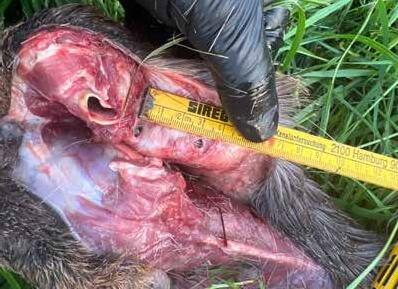 Bild: Rehkitz, Stück war stark abgemagert und stark mit Ektoparasiten befallen. Kehlbiss vom Fuchs, Zahnabstand 2,5cm, mehrere Bissstellen, geringe Gewebeverletztungen.