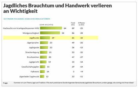Gerne hoch gehalten und zum Teil folkloristisch präsentiert wird das jagdliche Brauchtum und Handwerk von der Jägersprache bis zum Liedwerk. Doch auch hier findet sich eine besorgniserregende Erosion. Bis auf die Falknerei sind alle Trendwerte stark zurück gegangen. Mit anderen Worten: Handwerk und Brauchtum werden 2024 als deutlich weniger wichtig als noch 2011 eingestuft. Während die Nachsuche und die www.steirische-jaegerin.at