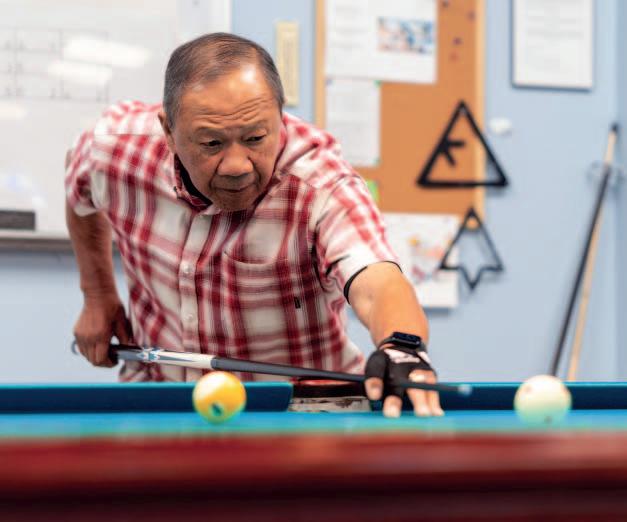 Butch Nery enjoys an afternoon at the billiards table, practicing strategy and sharing laughs with friends. Friendly competition keeps minds sharp and spirits high. At Blue Skies, fun and social connections help residents stay healthy and active.