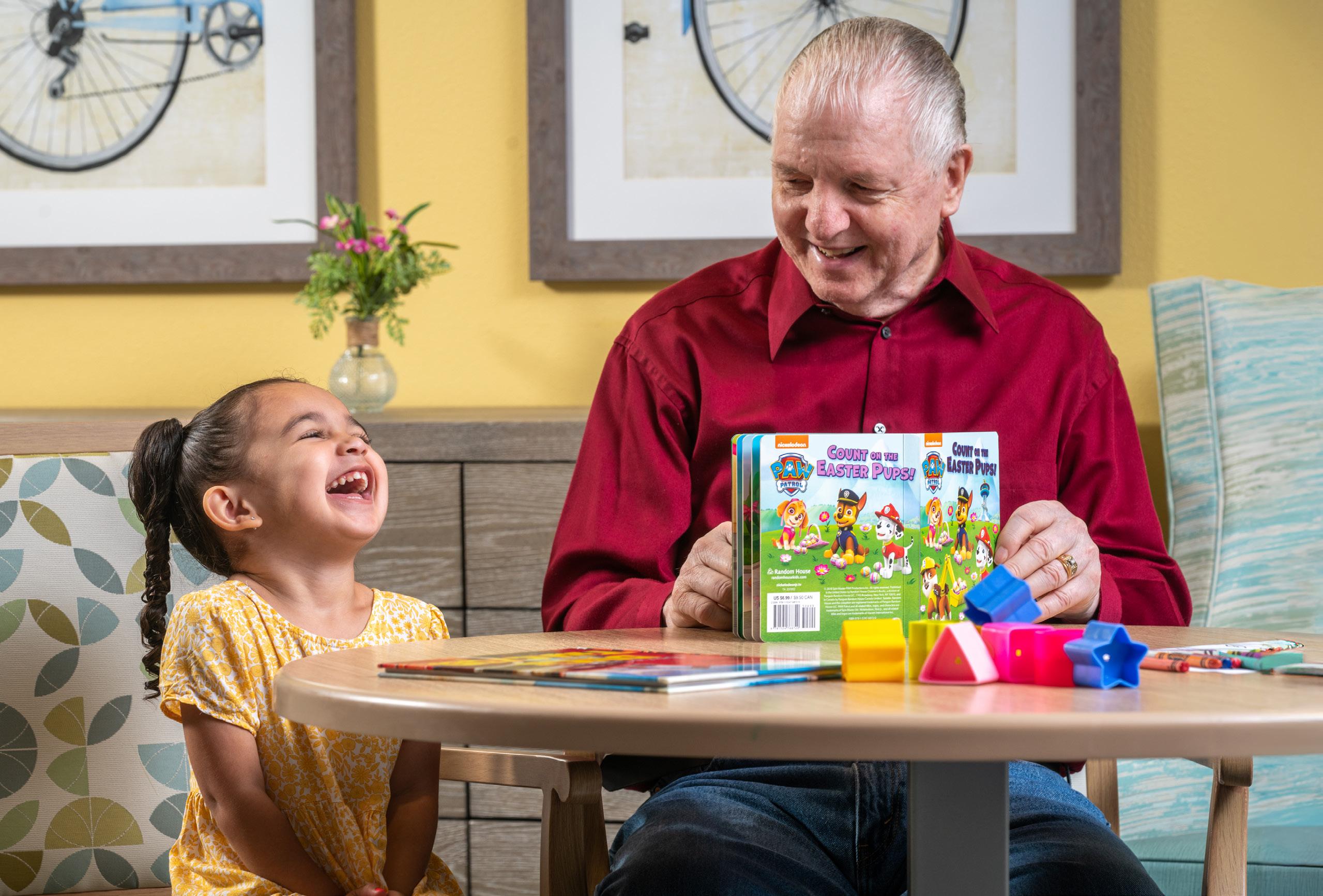 The preschool is located in Freedom House, the community’s memory care residence, and it turns each day into a playful adventure for the kids. As the name suggests, the preschool encourages intergenerational engagement between the children and our senior residents. Children and residents can be seen reading together, coloring, making crafts, doing puzzles and more, depending on the day.