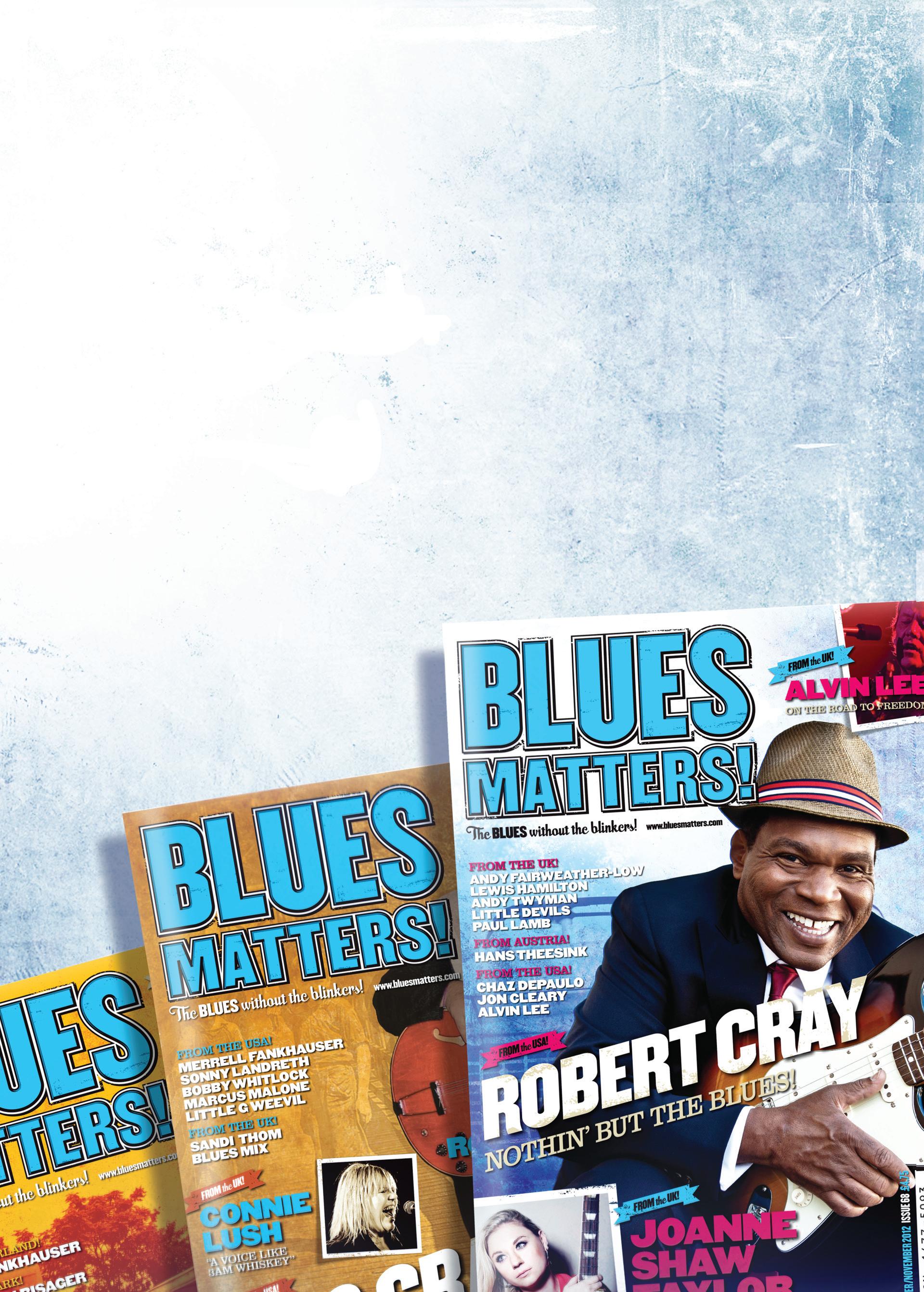 © 2012 blues matters! Original material in this magazine is © the authors. Reproduction may only be made with prior consent of the Editor and provided that acknowledgement is given of the source and copy is sent to the editorial address. Care is taken to ensure that the contents of this magazine are accurate but the publishers do not accept any responsibility for errors that may occur or views expressed editorially. All rights reserved. No parts of this magazine may be reproduced, stored in a retrieval system or transmitted in any form or by any means electronic, mechanical, photocopying recording or otherwise without prior permission of the editor. Submissions: Readers are invited to submit articles, letters and photographs for publication. The publishers reserve the right to amend any submissions and cannot accept responsibility for loss or damage. Please note: Once submitted material becomes the intellectual property of Blues Matters and can only later be withdrawn from publication at the expediency of Blues Matters. Advertisements: Whilst responsible care is taken in accepting advertisements if in doubt readers should make their own enquiries. The publisher cannot accept any responsibility for any resulting unsatisfactory transactions, nor shall they be liable for any loss or damage to any person acting on information contained in this publication. We will however investigate complaints.