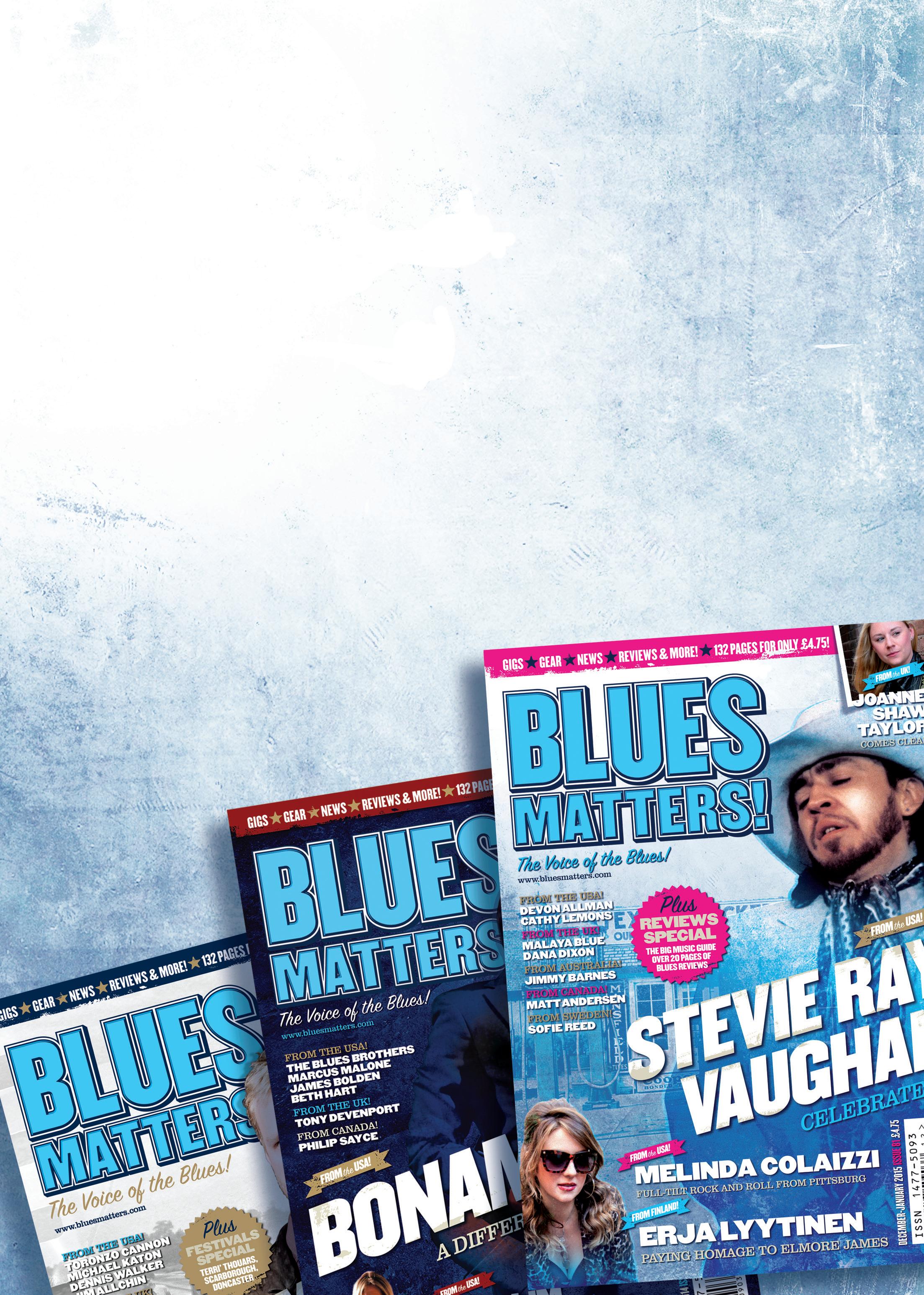 © 2014 blues Matters! Original material in this magazine is © the authors. Reproduction may only be made with prior consent of the Editor and provided that acknowledgement is given of the source and copy is sent to the editorial address. Care is taken to ensure that the contents of this magazine are accurate but the publishers do not accept any responsibility for errors that may occur or views expressed editorially. All rights reserved. No parts of this magazine may be reproduced, stored in a retrieval system or transmitted in any form or by any means electronic, mechanical, photocopying recording or otherwise without prior permission of the editor. Submissions: Readers are invited to submit articles, letters and photographs for publication. The publishers reserve the right to amend any submissions and cannot accept responsibility for loss or damage. Please note: Once submitted material becomes the intellectual property of Blues Matters and can only later be withdrawn from publication at the expediency of Blues Matters!