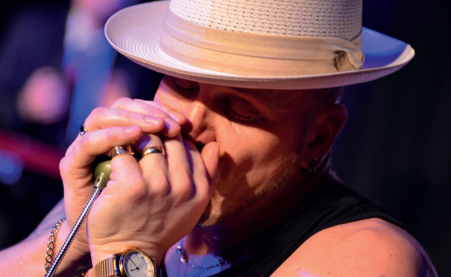 success. There were good reports of solo acts Graham Straughton and Benjamin Bassford and the top-class Christian Sharpe Trio. The other new feature this year was a Blues Cruise, which was certainly a highlight of the weekend. Brilliant sunshine, stunning lake views, a well-stocked onboard bar, and wonderful acoustic blues from two masters of the genre, Jon Amor and Sean Webster, definitely made for a winning combination. Sean and Jon are long-time friends and musical collaborators, which enabled them to back each other effortlessly –and their rapport was clear for all to see. It is to be hoped that the Blues Cruise becomes a regular feature of this very special festival. Meanwhile, back on land, there were some very talented bands kicking up a storm in various trail venues. Young West Country trio The Blue Horizon won over lots of new fans with their highly original brand of rocking blues. Long-haired frontman Iain Eccleston is an extremely gifted guitarist and vocalist, and he was very ably supported by Ed Gerlach on bass and Josh Armitage on drums. With Pete Feenstra championing their debut album, this is another young band who are definitely going places. Scottish/Cumbrian band Redfish played a pleasing set at Beresford’s, local outfit the Elderly Brothers drew a crowd at the Hole in t’Wall, the Della Grants and Paul Rose won several encores at the Hydro, and last-minute booking Secure Unit put on a stupendous performance at the Boat Club. Fronted by the aforementioned Dean Newton, Secure Unit’s line-up includes veteran bassist Gordon Colquitt, legendary Cumbrian drummer Frank Hall (ex-bandmate of one Ozzy Osbourne) and on keyboards Jon Marcangelo (ex-Violinski member). At this gig they were also joined by virtuoso saxophonist Roz Sluman. What a treat!