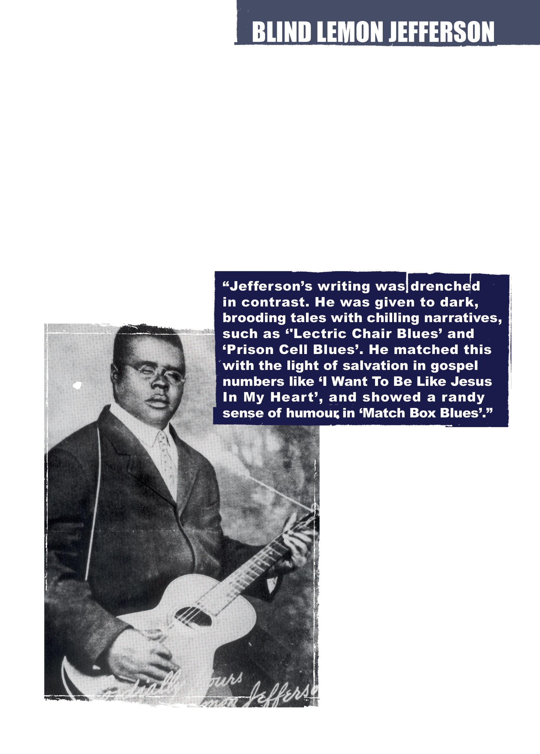 lind Lemon Jefferson left a musical legacy that had a significant influence on succeeding generations of Blues artists; Lightnin’ Hopkins, B.B. King and TBone Walker are among the giants who acknowledge Jefferson's impact on their own work. Many of Jefferson’s songs, such as ‘Black Snake Moan’, ‘See That My Grave Is Kept Clean’ and ‘Easy Rider Blues’, are recognised as classics of the Blues genre, whilst Jefferson took a place in rock’n’roll history when his ‘Match Box Blues’ served as the foundation for Carl Perkins' 1957 rewrite ‘Match Box’, which was later covered by The Beatles. He was a truly unique talent!