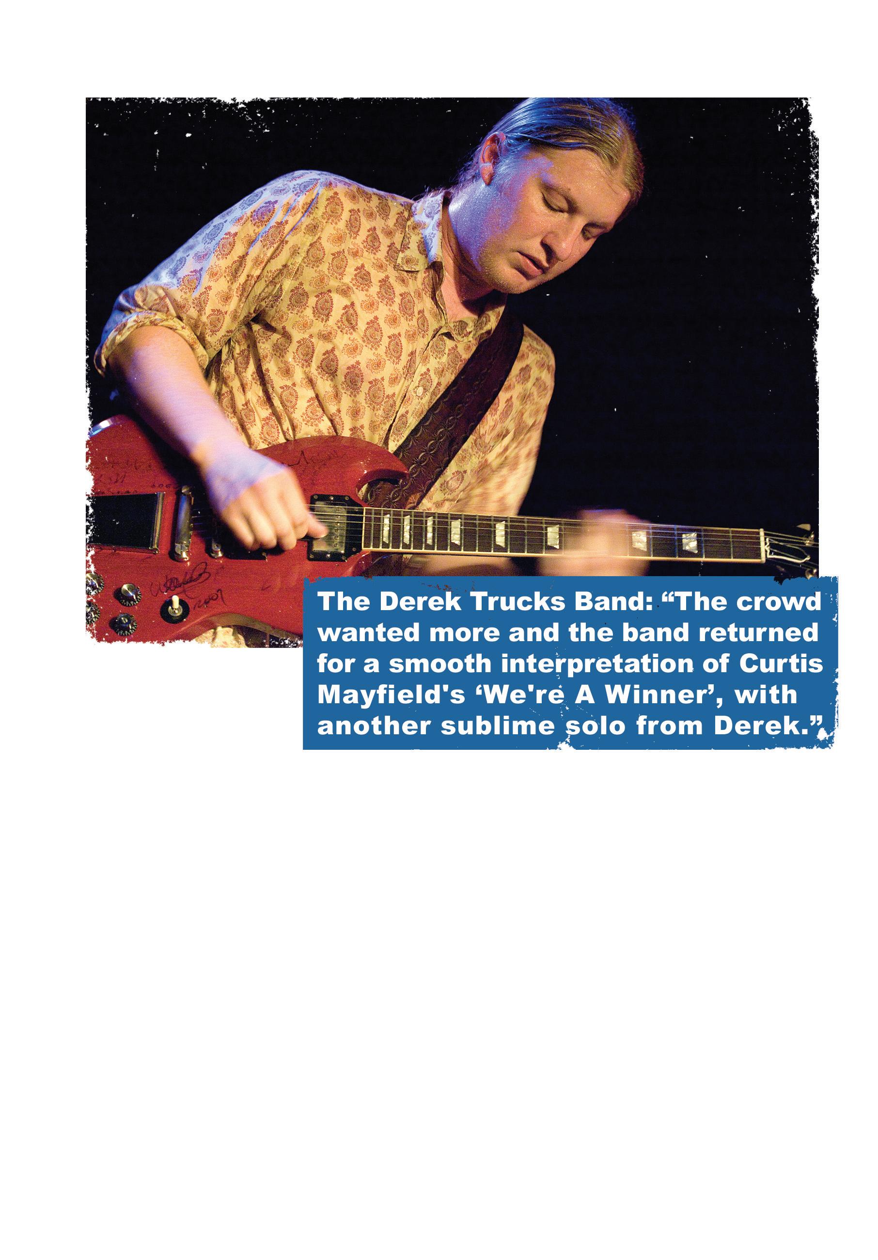 The first headlining date by the Derek Trucks Band in Glasgow saw them play before a near capacity audience, who gave an appreciative roar as the band started with the opening track ‘Down In The Flood’. It sounded fuller than on record, with little additional nuances from each band member. The balance was great, and we knew we were in for a treat. Post gig drummer Yonrico Scott commented he had never seen Derek roll up his sleeves on stage before, but that’s what he did, as if to say, “Let’s get down to business!” The band’s pre “Already Free” live favourite, ‘Don’t Don’t Bother Me‘ was next, with great vocals by Mike Mattison, before an older treat in ‘Soul Serenade‘, the first to showcase some of the band’s more worldly influences. Derek was the main focus point, and his playing was exceptional throughout, yet each of the band were given their space to shine, in particular Kofi Burbridge on keyboards and flute. Most of the crowd joined in to sing ‘I’ll Find My Way’, boogied to the up-tempo slide guitar tune ‘Get What You Deserve’, before watching in admiration on the mellow ‘Mahjoun.’ During ‘Sweet Inspiration’, you could spot a slight smile to Derek’s face, and it was clear to see the band were equally enjoying the show. What is notable about the Trucks band is the range of different styles they can play, from the Bluesy ‘Crow Jane’ to the funky extended groove of ‘Get Out Of My Life Woman’, and then a jazz excursion through ‘Greensleeves/Afro Blue’. Derek Trucks was named after Derek & The Dominoes, and they played a song synonymous with that band in ‘Key To The Highway’. The crowd wanted more and the band returned for a smooth interpretation of Curtis Mayfield's ‘We're A Winner’, with another sublime solo from Derek. As a bonus, we got a final encore with a ragged and climatic version of Howlin’ Wolf’s ‘Down In The Bottom’. All in all, it was a superb night in an intimate setting, from a band at the top of their game.