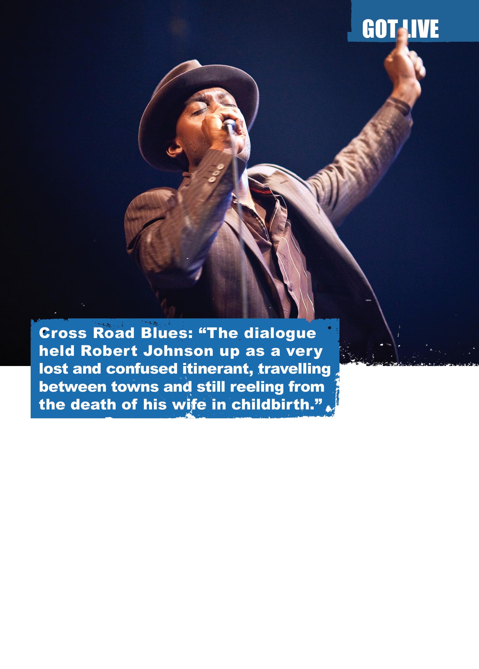 Very much a theatre experience rather than a gig, this was originally performed in Edinburgh, as part of the fringe, as a simple twohander portraying a fictional account of the night that Robert Johnson supposedly sold his soul to the devil at a crossroads outside Clarksdale Mississippi. The performance at the Empire was bolstered by the addition of a fine choir/chorus and some excellent musicians – especially Sophie Solomon on violin and Chris Allard on guitar – but it was still a two-hander, and all the more powerful for the simplicity of the setting and very fine performances by Christopher Clyde Green as Robert Johnson and Mario Vernazza (quite superb as ‘The Stranger’). The dialogue held Robert Johnson up as a very lost and confused itinerant, travelling between towns and still reeling from the bloody death of his wife in childbirth against the confident and manipulative white stranger, and made great play of the natural fear of a black man talking to a white man in the depths of ‘30s Mississsippi. Green’s portrayal of Johnson showed a very different side to the arrogant and cocksure individual we see staring out from the pictures of the time, but all the best lines go to ‘The Stranger’ and, at the end, the loudest applause seemed to be reserved for Vernazza for his powerful and creepy performance. The standing ovation was well deserved! If that had been the end of the evening then all would have been