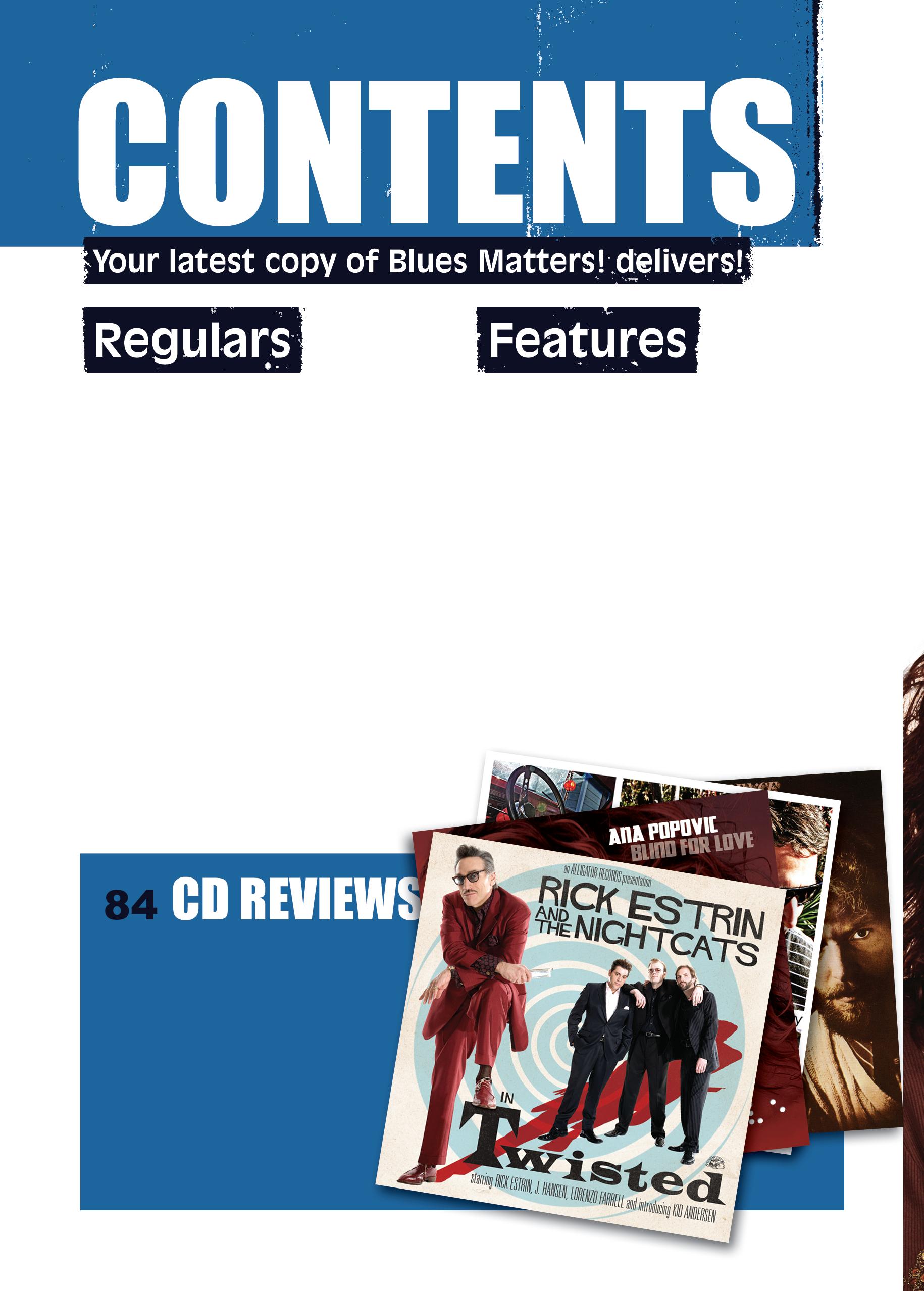 Alan ‘D’ Pearce t/a Blues Matters! Original material in this magazine is © the authors. Reproduction may only be made with prior consent of the editor and provided that acknowledgement is given of the source and copy sent to the editorial address. Care is taken to ensure that the contents of this magazine are accurate but the publishers do not accept any responsibility for errors that may occur or for the statements or views expressed editorially. All rights reserved. No part of this publication may be reproduced, stored in a retrieval system or transmitted in any form or by any means electronic, mechanical, photocopying, recording or otherwise without prior permission of the editor.