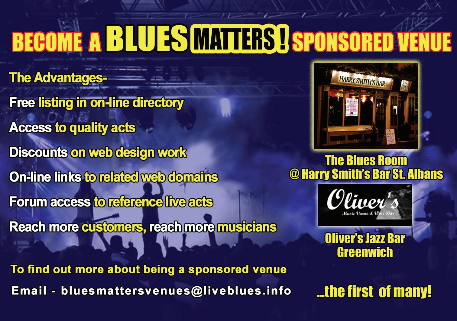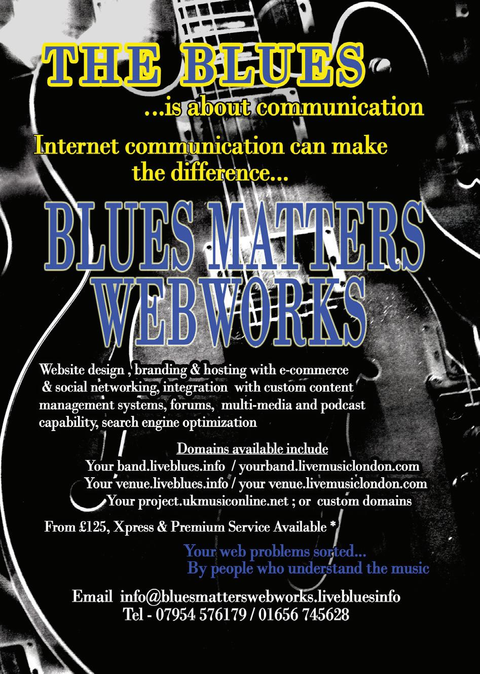 Alan ‘D’ Pearce t/a Blues Matters. Original material in this magazine is © the authors. Reproduction may only be made with prior consent of the Editor and provided that acknowledgement is given of the source and copy is sent to the editorial address. Care is taken to ensure that the contents of this magazine are accurate but the publishers do not accept any responsibility for errors that may occur or views expressed editorially. All rights reserved. No parts of this magazine may be reproduced, stored in a retrieval system or transmitted in any form or by any means electronic, mechanical, photocopying recording or otherwise without prior permission of the editor. Submissions: Readers are invited to submit articles, letters and photographs for publication. The publishers reserve the right to amend any submissions and cannot accept responsibility for loss or damage. Please note: Once submitted material becomes the intellectual property of Blues Matters and can only later be withdrawn from publication at the expediency of Blues Matters. Advertisements: Whilst responsible care is taken in accepting advertisements if in doubt readers should make their own enquiries. The publisher cannot accept any responsibility for any resulting unsatisfactory transactions, nor shall they be liable for any loss or damage to any person acting on information contained in this publication. We will however investigate complaints.