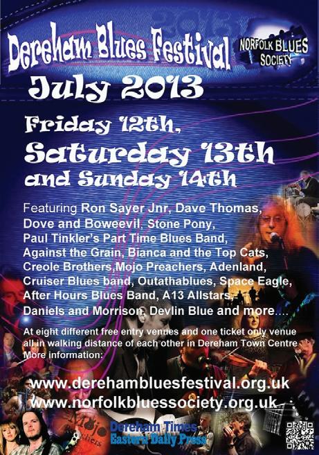 Norfolk Blues society (nofolkbluessociety.org.uk) is organising a three day blues festival first for Norfolk, with bands playing simultaneously at eight venues in the centre of Dereham, all within walking distance of each other. A chance to see a whole ‘mess o blues’ from Mississippi swamp through R&B, Chicago blues of Buddy Guy, Muddy Waters to Hendrix and Stevie Ray Vaughan right up to funky, verging on jazz. This is a not to be missed event of 2013 for all live blues fans as most venues other than for the headline artists are free to enter. Why Dereham? Blues