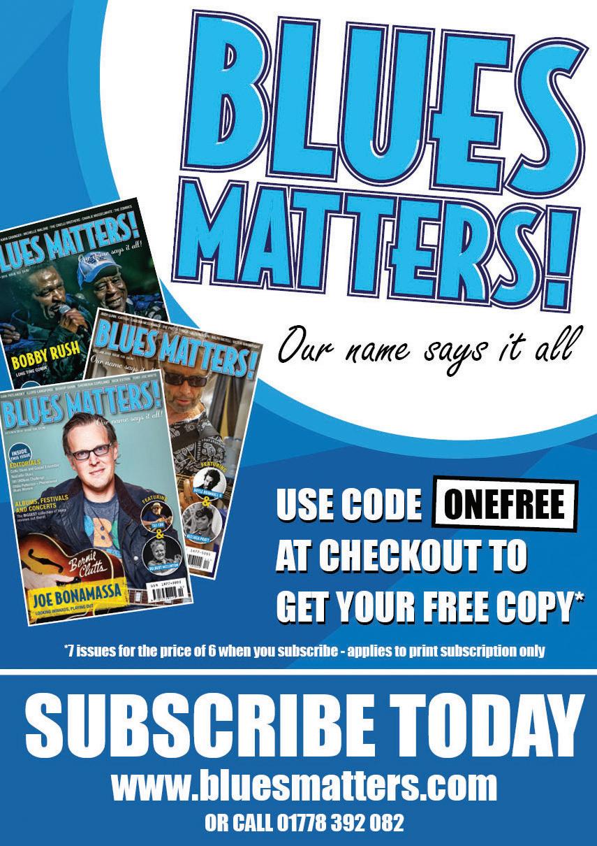 Original material in this magazine is © the authors. Reproduction may only be made with prior Editor consent and provided that acknowledgement is given of source and copy sent to the editorial address. Care is taken to ensure contents of this magazine are accurate but the publishers do not accept any responsibility for errors that may occur or views expressed editorially. All rights reserved. No parts of this magazine may be reproduced, stored in a retrieval system or transmitted in any form or by any means electronic, mechanical, photocopying recording or otherwise without prior permission of the editor. Submissions: Readers are invited to submit articles, letters and photographs for publication. The publishers reserve the right to amend any submissions and cannot accept responsibility for loss or damage. Please note: Once submitted material becomes the intellectual property of Blues Matters and can only later be withdrawn from publication at the expediency of Blues Matters. Advertisements: Whilst responsible care is taken in accepting advertisements if in doubt readers should make their own enquiries. The publisher cannot accept any responsibility for any resulting unsatisfactory transactions, nor shall they be liable for any loss or damage to any person acting on information contained in this publication. We will however investigate complaints.