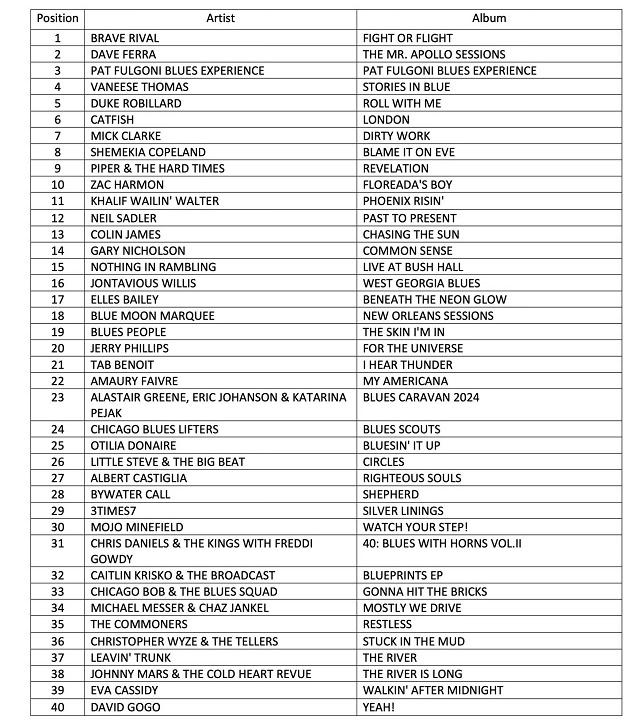 STORIES IN BLUE OVERTON MUSIC #14 JIMMY CARPENTER JUST GOT STARTED GULF COAST RECORDS #15 TAS CRU BAND LIVE: ALL NATURAL CAGE-FREE... SUBCAT #16 BENNY TURNER BT NOLA BLUE RECORDS #17 MARK HUMMEL TRUE BELIEVER ROCKINITUS RECORDS #18 J.D. SIMO AND LUTHER DICKINSON DO THE RUMP! FORTY BELOW RECORDS #19 VANESSA COLLIER DO IT MY OWN WAY PHENIX FIRE RECORDS #20 COLIN JAMES CHASING THE SUN STONY PLAIN #21 JONTAVIOUS WILLIS WEST GEORGIA BLUES STROLLING BLUES #22 JAKE SHIMABUKURO & MICK FLEETWOOD BLUES EXPERIENCE FORTY BELOW RECORDS #23 FRANK CATALANO / LURRIE BELL SET ME FREE