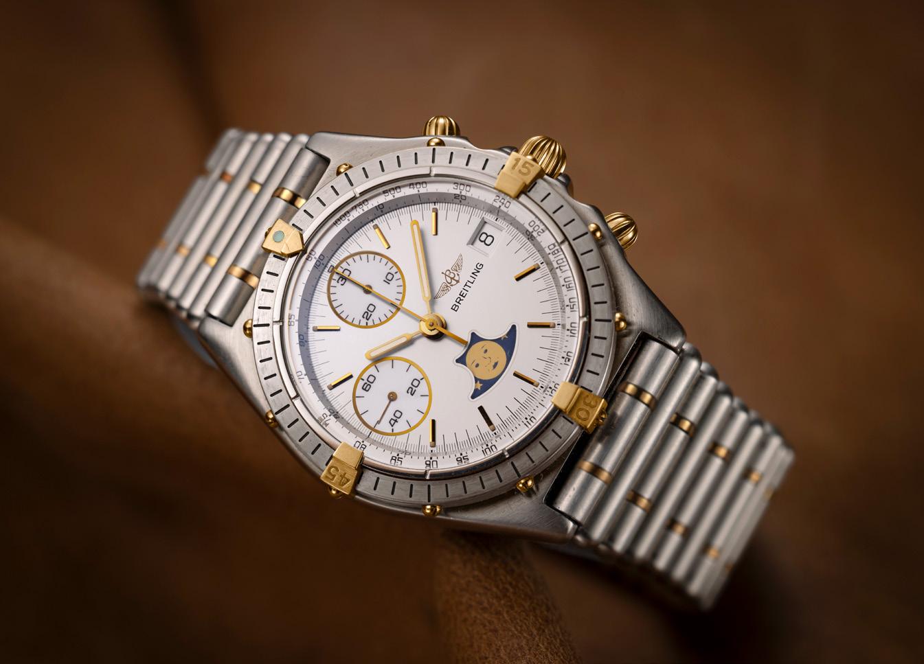 Launched at the end of the decade, it came in a two-tone case with black or white dials. Uncommon and unusual, the La Luna stood out for pairing the Chronomat’s sporty character with a decidedly dressier complication.