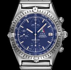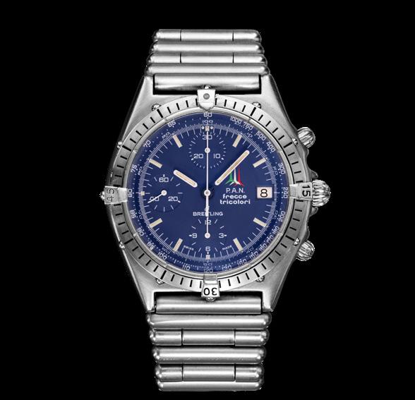 Instrument-panel look in blue created for the Frecce Tricolori with lumed dot on each side of 12 index and “Swiss Made” on each side of 6 subdial. The retail Chronomat, first in black (see picture on page 268), then white and two-tone, displayed the AOPA-style logo, with script B and BREITLING at 3.