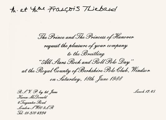Kenny Jones of The Who and Stewart Copeland of Police—collected Chronomats, while invited guests went home with their monogrammed invitations from The Prince and Princess of Hanover.