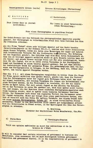 OPPOSITE, LEFT TO RIGHT: 1933 patent 175564 for the dual-pusher wrist chronograph; Willy’s 1935 interview stating his vision for a mass-market watch that would do for the chronograph what the Kodak “Brownie” had done for cameras