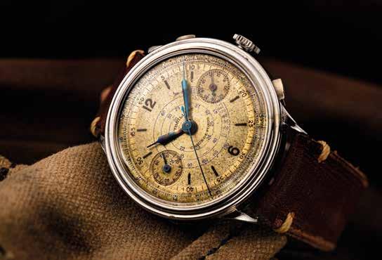 Willy continued to create tool-watch chronographs, but the market for them had yet to take hold beyond professional use. One of his efforts to tap into the pop- ular zeitgeist resulted in a puzzling foray into decorative cases, a brief trend from the 1920s that he tried to rekindle in chronographs in the late 1930s. These exuberant pieces, called “Dernier Cri,” had elaborately shaped lug attachments that completely overshadowed the functionality of the chronograph. It’s hard to tell whether Willy was truly serious about these overly decorative pieces. Pictures from the 1937 catalog reveal them to be what can only be described as outlandish. To make matters more confusing, he went so far as to register their designs to protect them from copycats.