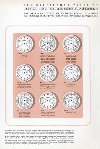 Beginning in 1940, Breitling included a page in its catalog outlining the varieties of chronograph scales available (that year there were nine), along with the notice: “It is understood that all these variations can be supplied in all modern executions of dials … when passing orders, kindly state reference numbers concerning chronographic divisions.”