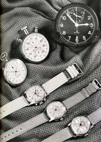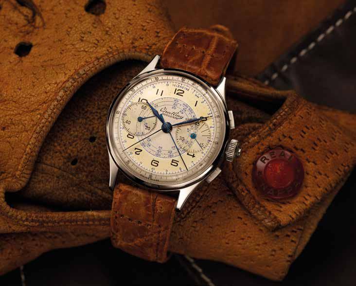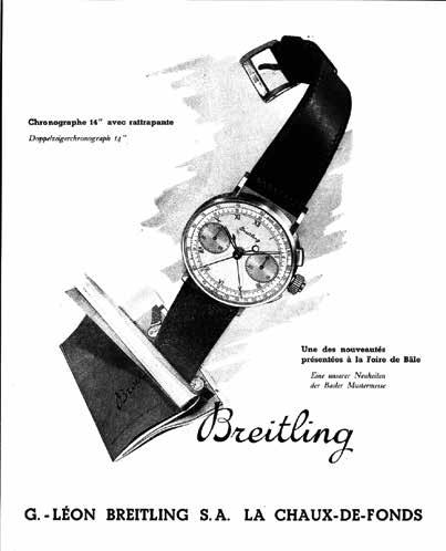 Willy’s next chess move: complications. The rattrapante, used to record multiple time intervals with its split-second hand, was (and still is) the highest complication you could add to the chronograph. It had been central to the company since 1900, when Leon Breitling proudly advertised his new models. Willy sought to build on his grandfather’s legacy by taking the split- second out of the pocket and onto the wrist. But this was the 1940s; Breitling was an industrial manufacturer now and couldn’t hand build ebauches like Leon did. The only available industrialized split-second standard ebauches were designed for pocket chronographs. The Valjoux 55VBR, used by Breitling for its wide selection of pocket rattrapantes
