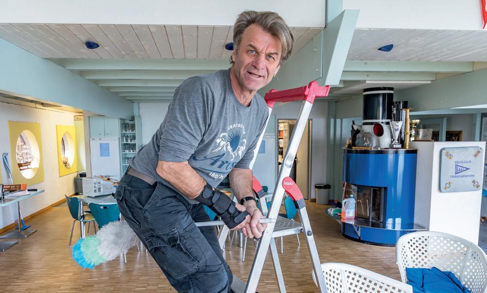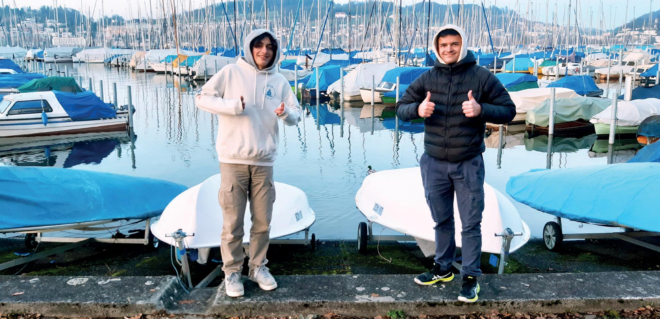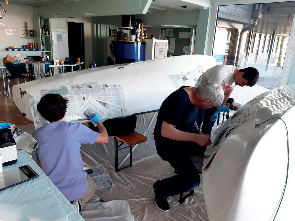 chestunden sparen. Das Problem war noch grösser als angenommen. Diese Risse sind genau am Übergang von der Rumpfschale und der Deckschale geschehen. Auch genau dort kommt noch die Kraft der Wanten dazu. Deshalb muss das auch wieder gut verschlossen werden, ansonsten drohen die Boote sozusagen auseinander zu fallen. Da wir die Boote beim ersten Training wieder benutzen möchten, musste die Reparatur noch während den Wintermonaten stattfinden. Für die Reparatur mit Epoxy darf es aber nicht zu kalt sein und deshalb musste dies im Innern geschehen. Zusätzlich wurde uns bewusst, dass wir auch während den Reparaturen auf Brunos Rat angewiesen sind. So haben wir uns auf Terminsuche gemacht. Gar nicht so einfach mit einem so viel beschäftigten Mann wie Bruno (wer mehr dazu wissen möchte, kann die erste Ausgabe vom 2023 nochmals aufblättern). Schlussendlich haben wir ein Wochenende im Januar gefunden. Das eben genannte Wochenende begann für Nico, Tomé und mich bereits am Freitagmittag mit einem Einkaufstrip in den "Jumbo", um die Einkaufsliste abzuhacken, die wir mit Bruno zusammen erstellt haben. Danach ging es zurück ins Clubhaus und wir starteten mit den Reparaturarbeiten. Wir haben die Boote auf den Vorplatz gehoben und bereit gemacht für den ersten Punkt auf dem Programm: Schleifen, schleifen, schleifen. Mit dem Schleifen entfernt man alle Unebenheiten und schafft einen guten Untergrund fürs Fiberglas. Dieser Schleifprozess erzeugt einiges an Staub, weshalb wir dies auch noch auf dem Vorplatz gemacht haben. Während den Schleifarbeiten sind uns noch weitere kleinere Schäden an den Rümpfen aufgefallen, sodass wir diese dann auch gleich mitbearbeitet haben. Erst lange nachdem die Sonne schon untergegangen ist, wurden wir fertig mit dem Schleifen. Daraufhin haben wir im Clubhaus Platz gemacht und alles abgedeckt und uns sozusagen eine kleine Werft eingerichtet. Die Boote durften die Nacht dann