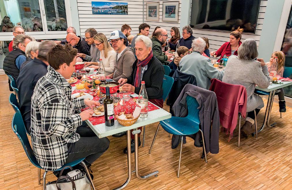 werdenden Fondue. Plötzlich ist es ruhig im Raum, die Rechaud's brennen und das Fondue wird serviert. Genügend Brot und Knoblauch (für die welche es mögen) steht auf dem Tisch. Auch Nachschlag ist möglich, was selbstverständlich bei Seglern rege benützt wird. So zieht sich das Ganze in die Länge und die Kinder wollen natürlich den "Samichlaus" sehen und werden