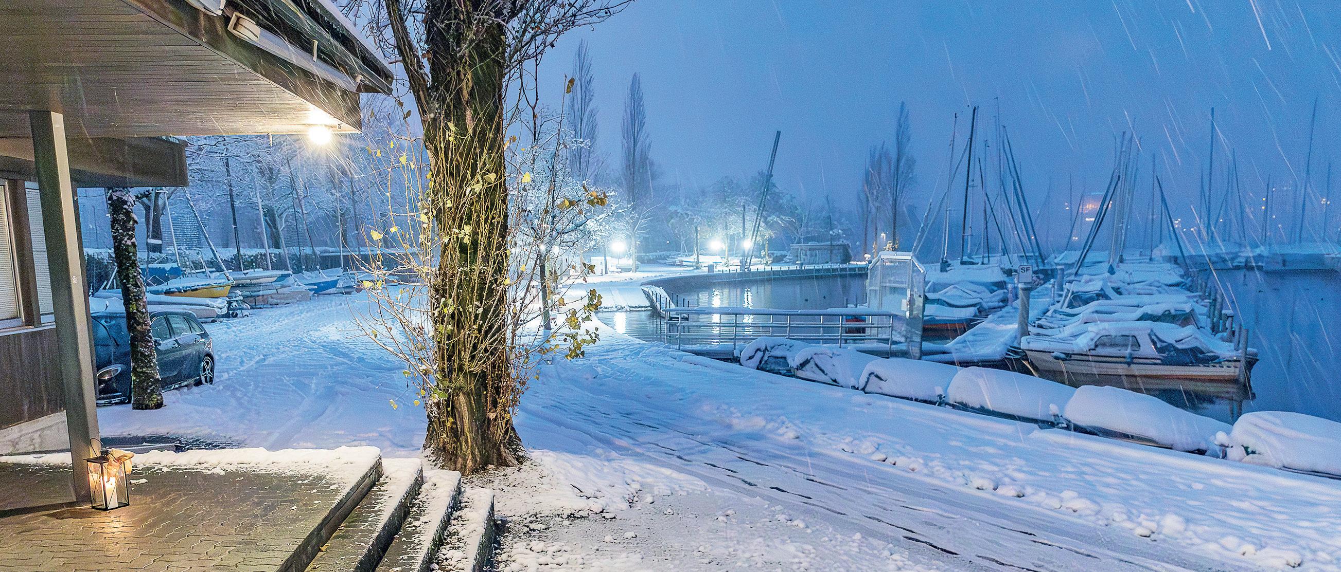 teten Tische und Dekorationen zu fotografieren. Zudem haben wir heute Abend eine wundervolle Winterlandschaft hier im Hafen Tribschenhorn, was natürlich super zu unserem Anlass passt. Andi begrüsst mich unter dem Vordach mit einer heissen Maroni, die dann später zusammen mit leckerem Glühwein als Apéro serviert werden. Im Clubhaus drinnen sind die Tische schon alle festlich gedeckt und aus der Küche riecht es nach Käse. Alois steht vor einer grossen Pfanne und rührt mit einer Holzkelle im langsam "sämig"