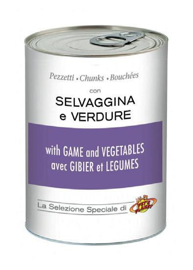 Composizione: carni e derivati (carni “preda intera” compresi, quindi, i relativi derivati: fegato, cuore, polmoni, trippe, ali e collo, e simili, selvaggina 8%), ortaggi 4,2%, cereali (integrali), uova e prodo i a base di uova, sostanze minerali. Additivi: Additivi nutrizionali: Vitamina A 1200 UI/kg, Vitamina D3 160 UI/kg, Vitamina E 3,5 mg/kg. Additivi tecnologici: addensanti e gelificanti Componenti Analitici: umidità 80%; proteina 8%; grassi grezzi 6%; fibra grezza 1%; ceneri grezze 3%. Kcal/kg 900