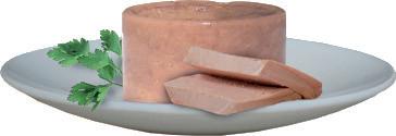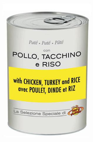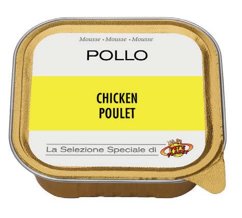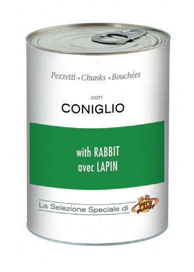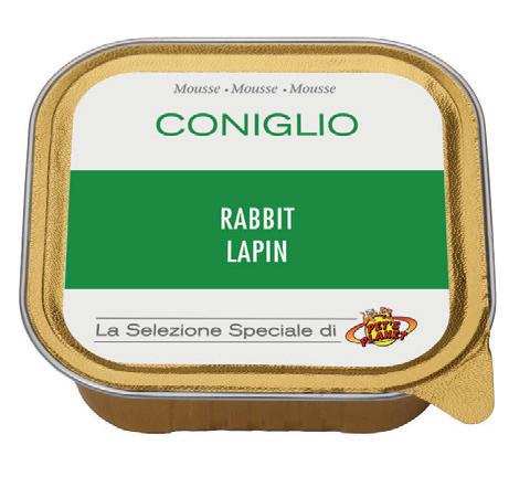 Composizione: carni e derivati (carni “preda intera” compresi, quindi, i relativi derivati: fegato, cuore, polmoni, trippe, e simili, coniglio 8%), cereali (integrali), uova e prodo i a base di uova, sostanze minerali. Additivi: Additivi nutrizionali: Vitamina A 1200 UI/kg, Vitamina D3 160 UI/kg, Vitamina E 3,5 mg/kg. Additivi tecnologici: addensanti e gelificanti. Componenti Analitici: umidità 80%; proteina 8%; grassi grezzi 6%; fibra grezza 1%; ceneri grezze 3%. Kcal/kg 900 405 g € 2,20