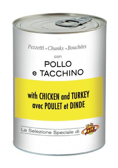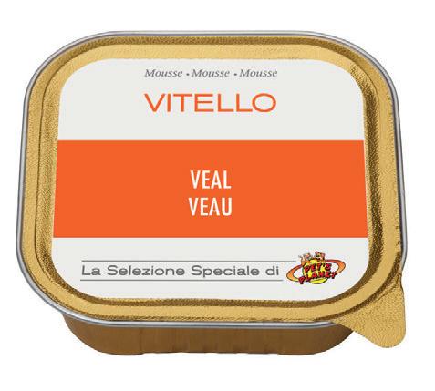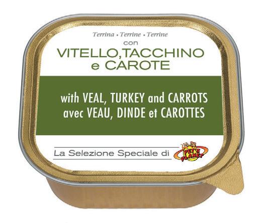 Composizione: carni e derivati 64% (carni “preda intera” di vitello 6% e tacchino 5% compresi, quindi, i relativi derivati: fegato, cuore, polmoni, trippe, ali e colli di tacchino, e simili), ortaggi (carote 6%), sostanze minerali. Additivi: Additivi nutrizionali: Vitamina A 2000 UI/kg, Vitamina D3 160 UI/kg, Vitamina E 5 mg/kg; Additivi tecnologici: addensanti e gelificantiComponenti Analitici: umidità 82%; proteina 9%; grassi grezzi 7,5%; fibra grezza 0,5%; ceneri grezze 1%. Kcal/kg 900