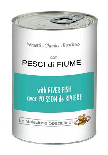 Composizione: carni e derivati (carni “preda intera” compresi, quindi, i relativi derivati: fegato, cuore, polmoni, trippe, e simili), pesci e so oprodo i dei pesci 21% (tu e le parti del pesce), cereali (riso integrale 5%), so oprodo i di origine vegetale (polpa di barbabietola, rosmarino, Fru o-oligosaccaridi), ortaggi, sostanze minerali. Additivi: Additivi nutrizionali: Vitamina D3 380 UI/kg, Vitamina E 70 mg/kg. Componenti Analitici: umidità 76%; proteina 8,2%; grassi grezzi 6,1%; fibra grezza 0,48%; ceneri grezze 1,9%. Kcal/kg 900