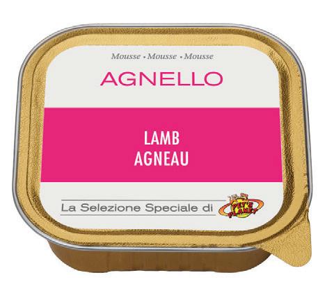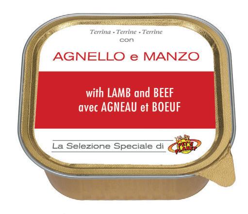 Composizione: carni e derivati 64% (carni “preda intera” di agnello 6% e manzo 5% compresi, quindi, i relativi derivati: fegato, cuore, polmoni, trippe, e simili), sostanze minerali. Additivi: Additivi nutrizionali: Vitamina A 2000 UI/kg, Vitamina D3 160 UI/kg, Vitamina E 5 mg/kg; Additivi tecnologici: addensanti e gelificanti. Componenti Analitici: umidità 82%; proteina 9%; grassi grezzi 7,5%; fibra grezza 0,5%; ceneri grezze 1%. Kcal/kg 900