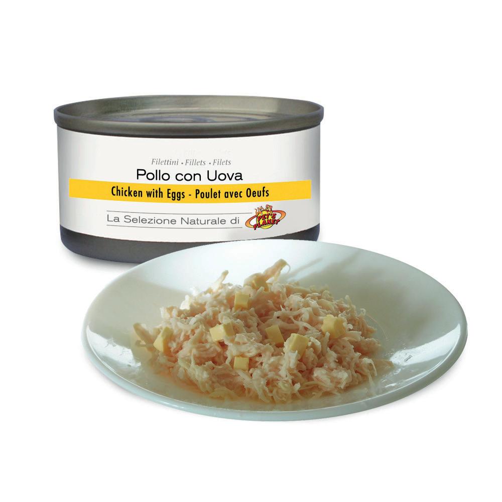 Composizione: pollo 49%, uova 5,88%, amido di tapioca 1%, glucosio.