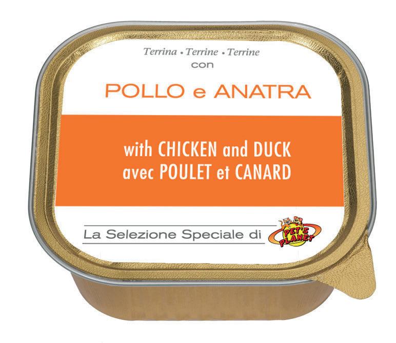 Composizione: carni e derivati (carni “preda intera” compresi, quindi, i relativi derivati: fegato, cuore, polmoni, trippe, ali e collo di pollo e tacchino e simili, pollo 12%, tacchino 8%), cereali (integrali), uova e prodo i a base di uova, sostanze minerali. Additivi: Additivi nutrizionali: Vitamina A 1200 UI/kg, Vitamina D3 160 UI/kg, Vitamina E 3,5 mg/kg. Additivi tecnologici: addensanti e gelificanti Componenti Analitici: umidità 80%; proteina 8%; grassi grezzi 6%; fibra grezza 1%; ceneri grezze 3%.. Kcal/kg 900