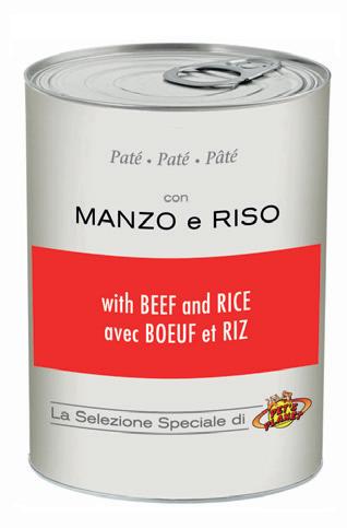 Composizione: carni e derivati (carni “preda intera” compresi, quindi, i relativi derivati: fegato, cuore, polmoni, trippe, e simili, manzo 8%), cereali (riso integrale 4,2%), ortaggi 4,2%, uova e prodo i a base di uova, sostanze minerali. Additivi: Additivi nutrizionali: Vitamina A 1200 UI/kg, Vitamina D3 160 UI/kg, Vitamina E 3,5 mg/kg. Additivi tecnologici: addensanti e gelificanti. Componenti Analitici: umidità 80%; proteina 8%; grassi grezzi 6%; fibra grezza 1%; ceneri grezze 3%. Kcal/kg 900