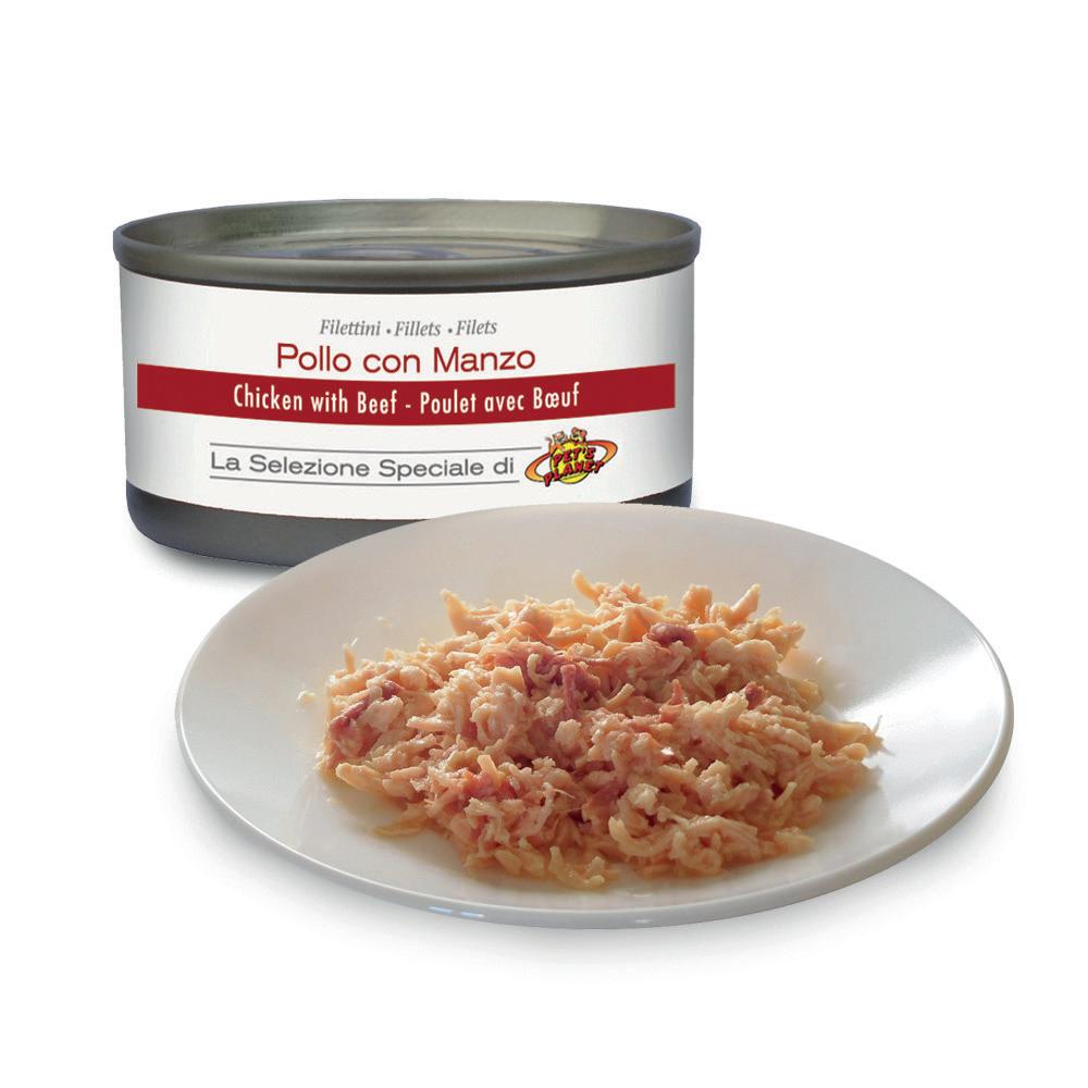 Composizione: pollo 47,3%, brodo di pollo, manzo 5,7%, amido di tapioca 1%, glucosio.