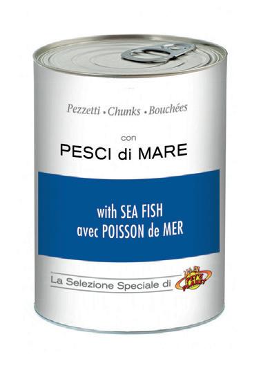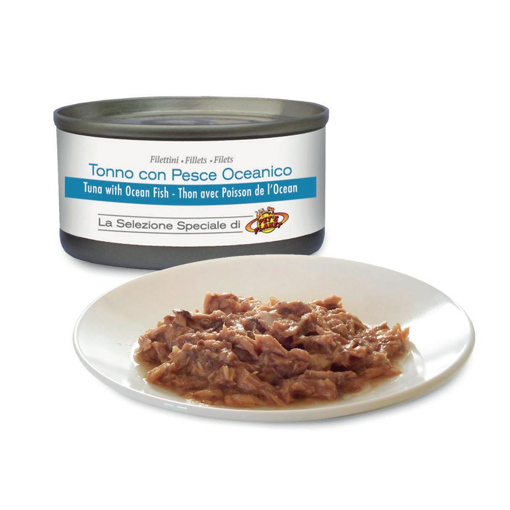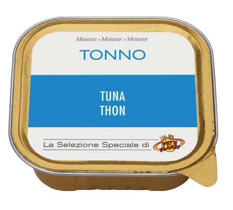 Composizione: tonno 50%, pesce oceanico 4%, amido di tapioca 1%, glucosio.