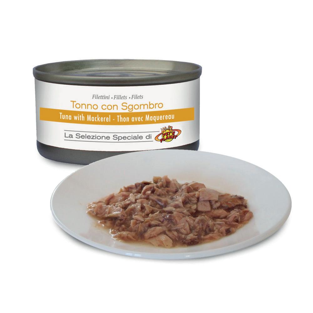 Composizione: tonno 50%, sgombro 4%, amido di tapioca 1%, glucosio.
