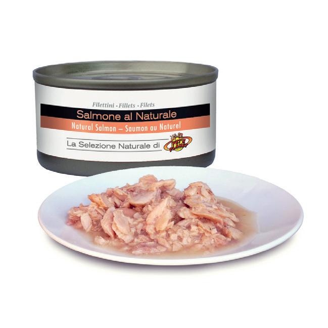 Composizione: carni e derivati (carni “preda intera” compresi, quindi, i relativi derivati: fegato, cuore, polmoni, trippe, e simili), pesci e so oprodo i dei pesci (tu e le parti del salmone 5% e della trota 5%) cereali (integrali), uova e prodo i a base di uova, sostanze minerali. Additivi: Additivi nutrizionali: Vitamina A 1200 UI/kg, Vitamina D3 160 UI/kg, Vitamina E 3,5 mg/kg. Additivi tecnologici: addensanti e gelificanti. Componenti Analitici: umidità 80%; proteina 8%; grassi grezzi 6%; fibra grezza 1%; ceneri grezze 3%. Kcal/kg 900