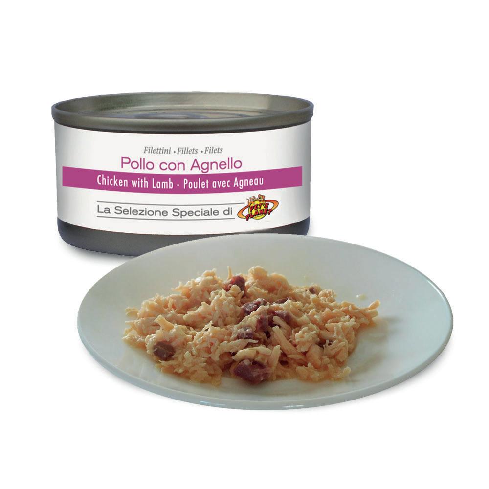 Composizione: pollo 47,3%, brodo di pollo, agnello 5,7%, amido di tapioca 1%, glucosio.