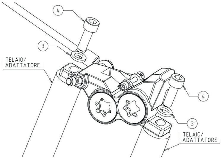 Installare la pinza freno sul telaio della bicicletta; se è necessario l’utilizzo di un adattatore, lo stesso deve essere posizionato tra il telaio e la pinza. Install the caliper on the bike frame, if an adapter is required it must be positioned between the bike frame and the caliper.