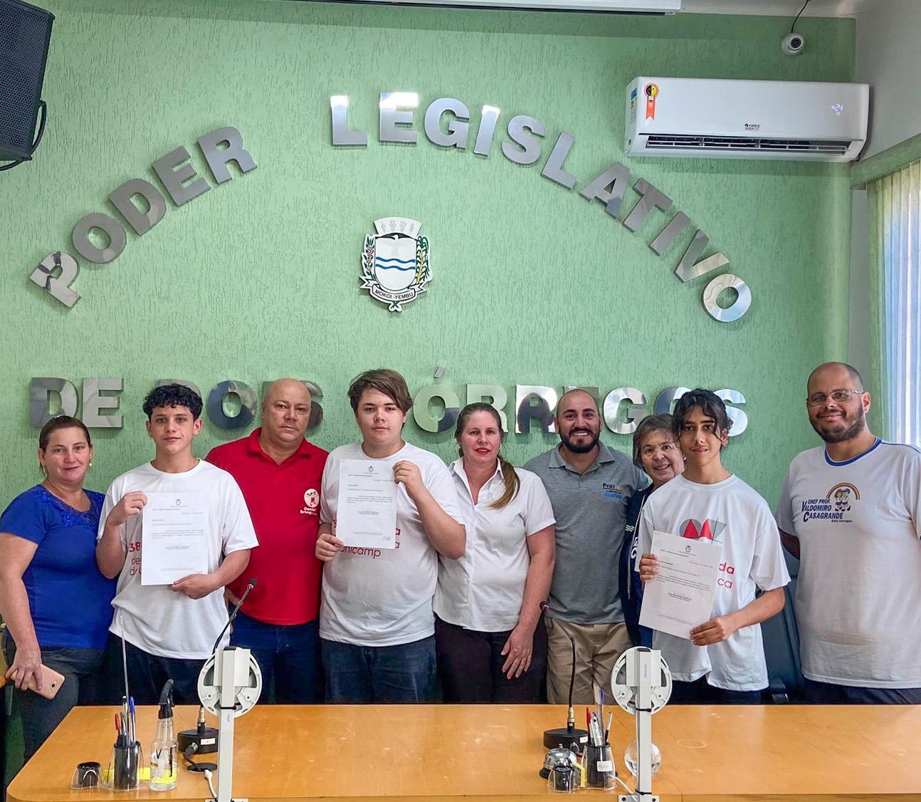 Os alunos Luiz Felipe Mar tins, Rafael Oliveira e Vic tor Barbosa receberam uma moção de aplausos de autoria do vereador Vinícius de Olivei ra. A homenagem foi realizada na Câmara Municipal de Dois Córregos no última segundafeira (7).