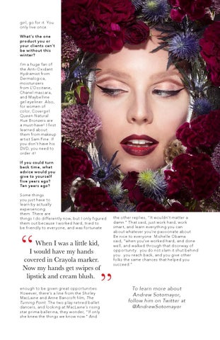 girl, go for it. You only live once. What’s the one product you or your clients can’t be without this winter? I’m a huge fan of the Anti-Oxidant Hydramist from Dermalogica, moisturizers from L’Occitane, Chanel mascara, and Maybelline gel eyeliner. Also, for women of color, Covergirl Queen Natural Hue Bronzers are a must-have! I first learned about them from makeup ar tist Sam Fine. If you don’t have his DVD, you need to order it! If you could turn back time, what advice would you give to yourself five years ago? Ten years ago? Some things you just have to learn by ac tually experiencing them. There are things I do differently now, but I only figured them out because I worked hard, tried to be friendly to ever yone, and was for tunate