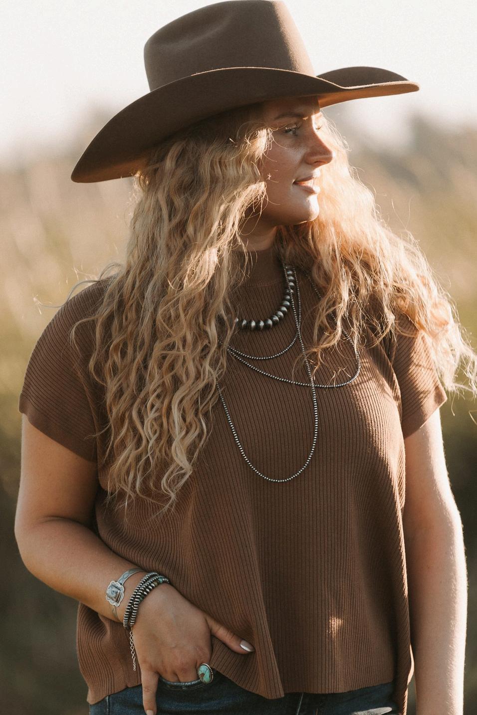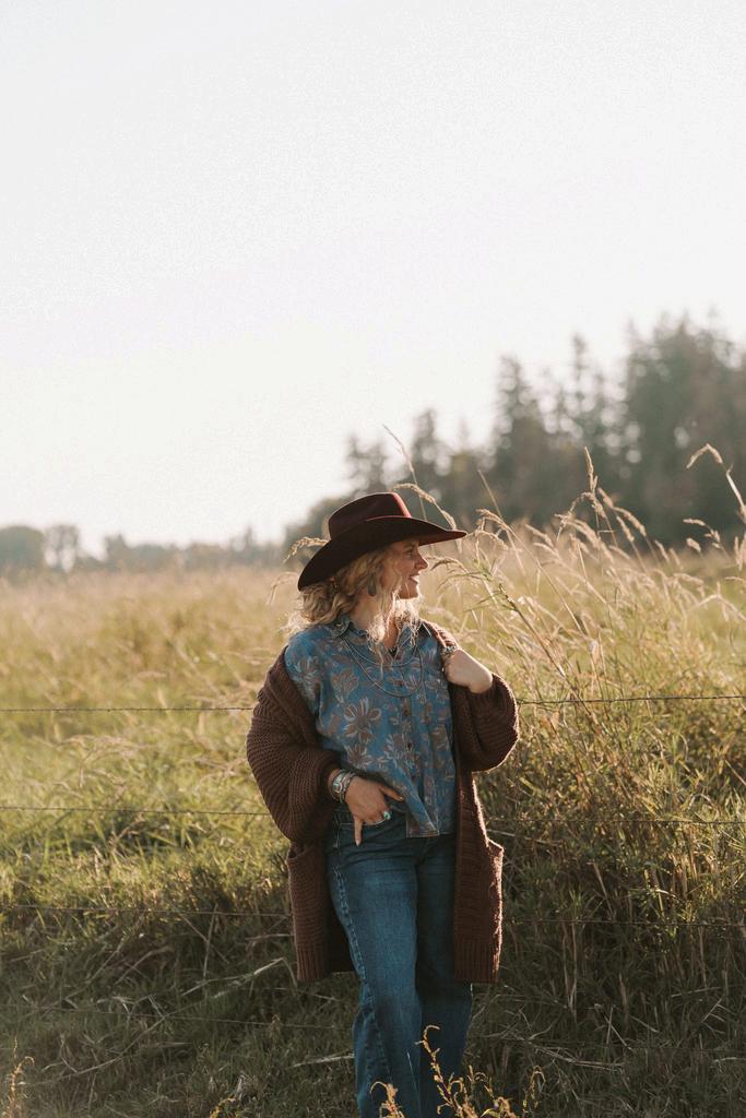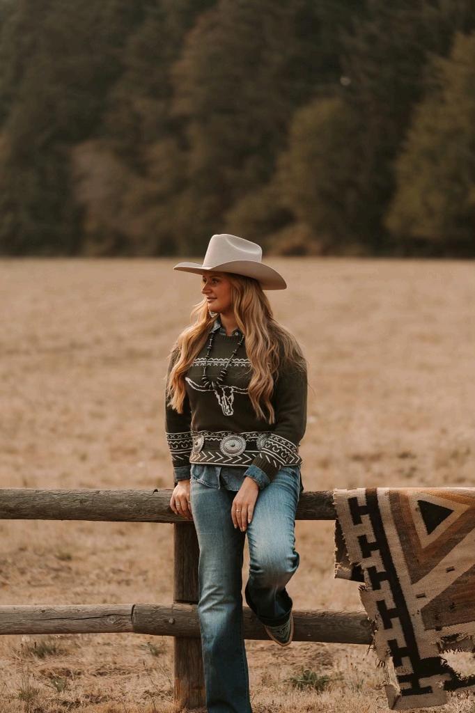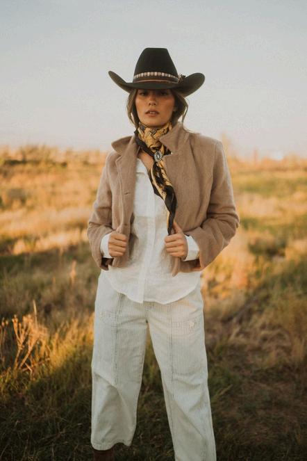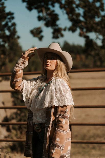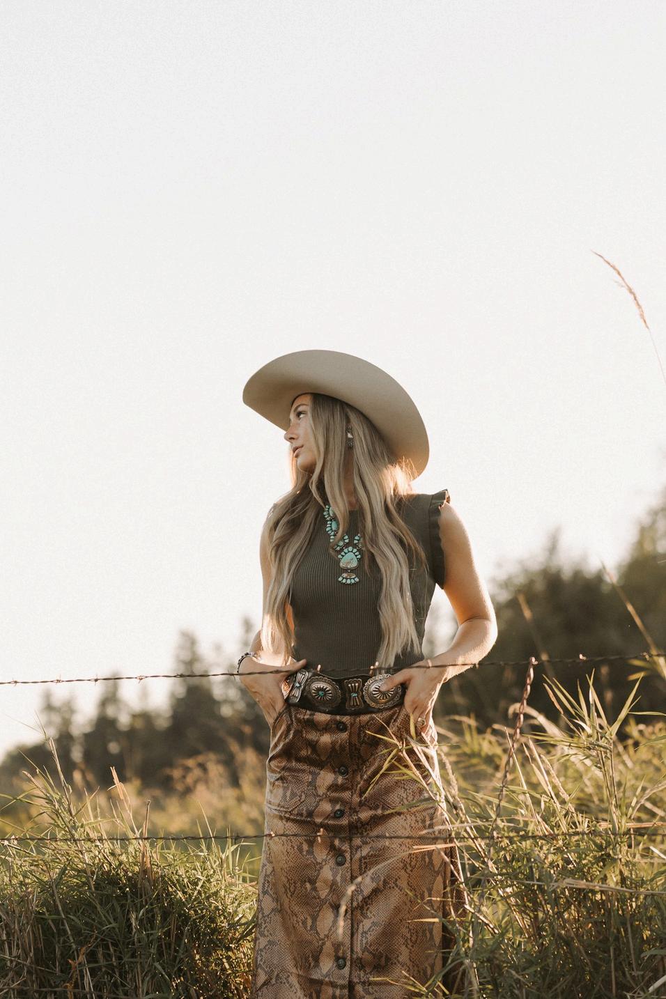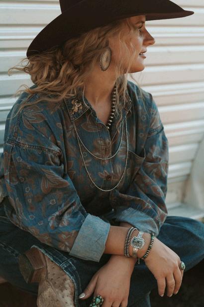 The {Las Cruces Blouse} is giving all the elegant and feminine vibes with a touch of western. Kjersti paired this look with a brownolive cowboy hat which we believe completes the look! This piece is a definite need, and can be styled with all the denim and skirts.