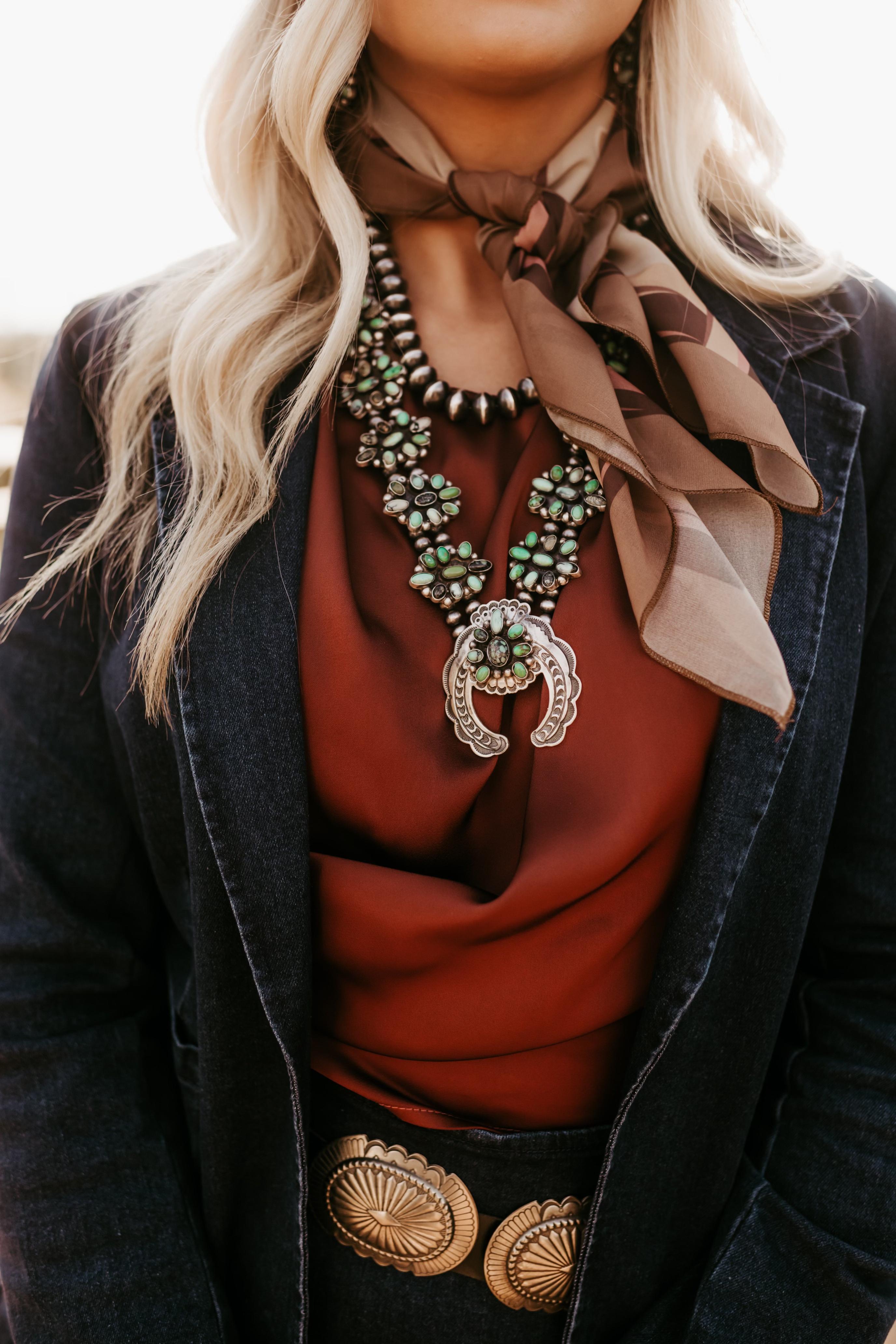 There is nothing classier than a blazer, so when you style it up with a Native American Squash Blossom and Navajo Pearls, you betcha this quickly became a favorite look!